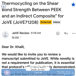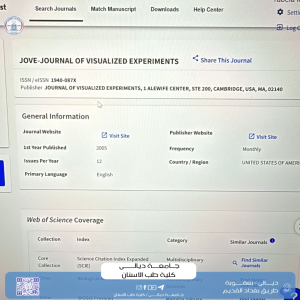 تعد مجلة JoVE من المجلات العلمية الرائدة والمتخصصة في نشر الأبحاث العلمية، والسريرية وهي مجلة عالمية محكمة ومصنفة ضمن مستوعبات كلاريفيت (Clarivate) و Web of Science (WoS)، وتبلغ قيمة معامل التأثير (Impact Factor) الخاص بها 1.5. ويأتي اختيار التدريسي في كلية طب الأسنان للمساهمة في تحكيم الأبحاث المقدمة للمجلة، تتويجاً لجهوده العلمية المتميزة وخبرته البحثية الواسعة في اختصاصه، مما يعكس الثقة الكبيرة التي يحظى بها على المستوى الدولي.